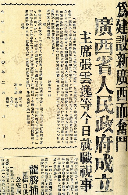 1949年9月,中共广西省委在武汉成立,11月30日,随解放大军到达桂林,随即领导广西各族人民建立各级人民政权,进行剿匪反霸、维护社会治安、恢复和发展生产,取缔卖淫嫖娼、贩毒吸毒、聚众赌博等各种丑恶现象,在很短的时间内就使广西发生了翻天覆地的变化。