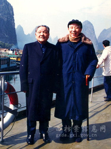年1月,邓小平与王震游桂林漓江时在游船上合影。