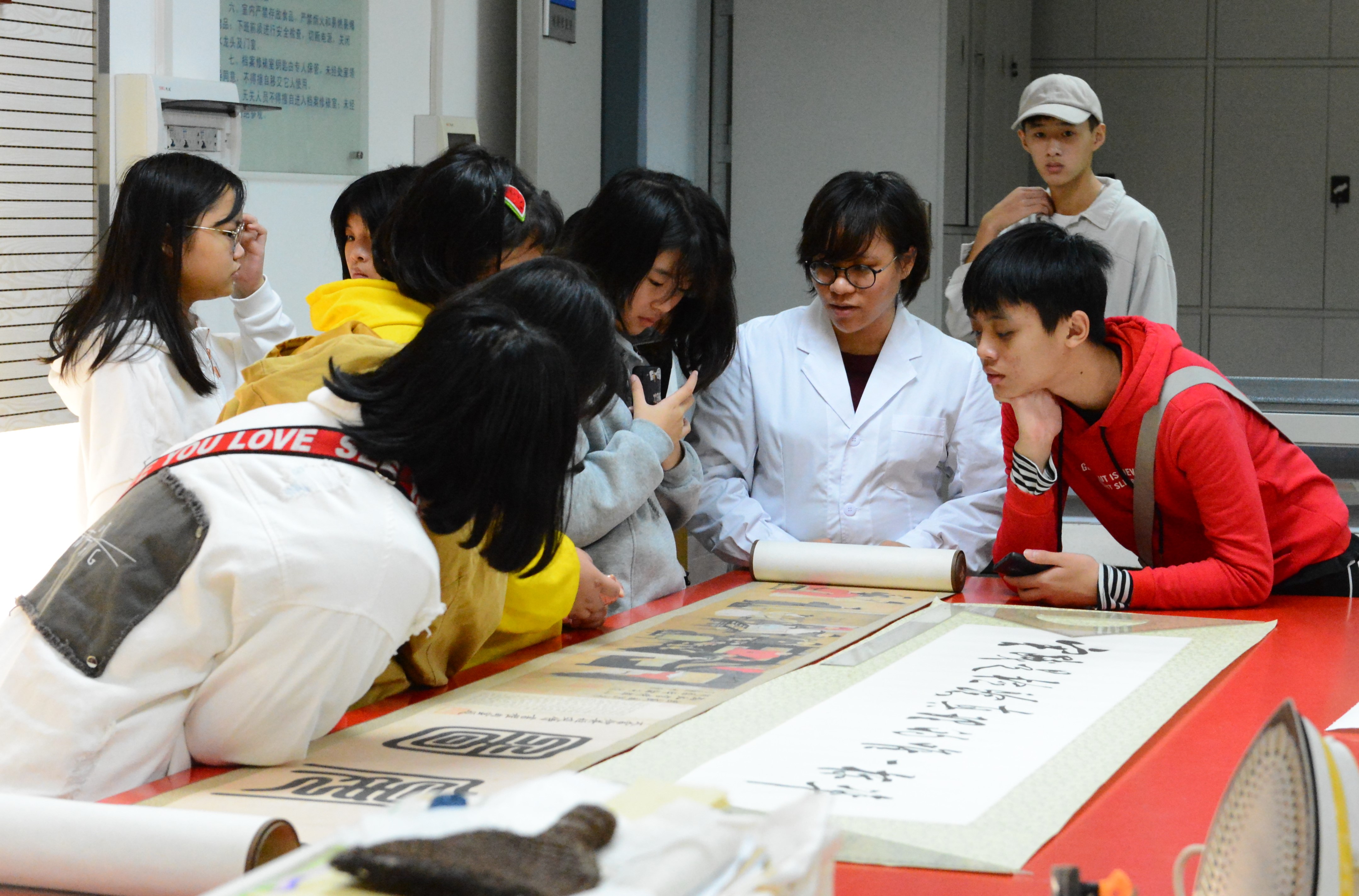 参加“工艺讲堂”的学生在学习档案修裱技术