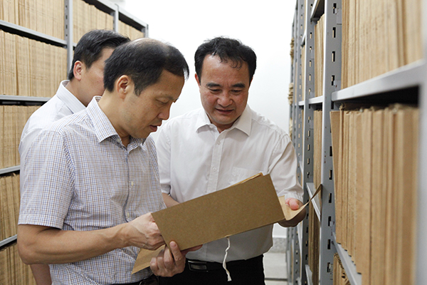 自治区党委组织部常务副部长莫诗浦查看库房档案(左一)
