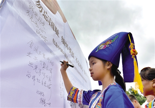 图为昆仑村小学学生在签名墙上签名