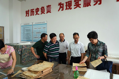 梧州市档案局局长宁波(右二)向钦州市档案局长翟飞雯(右一)介绍档案裱糊工作