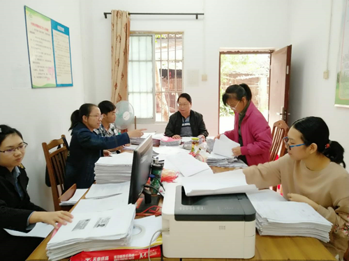 图为何景明局长(右三)在板棍乡土地确权办进行土地确权档案指导工作